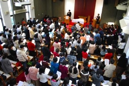 現在140名程の人たちが神様の招きの応えて出席しているこの礼拝は、 教会の中心である大切な集会です。できれば10分程前に着席して心を落ちつけ、 神様に心を向ける準備をしましょう。